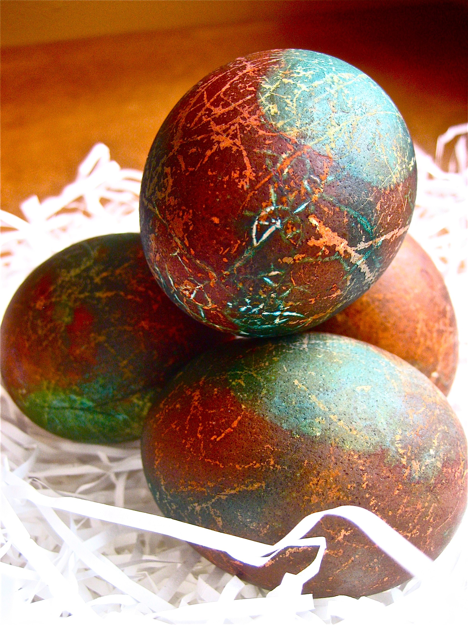 (2) Place hard boiled white eggs (in the shells) into the jars. Let them sit for a few minutes, then move them around from jar to jar until you are happy with the base color.