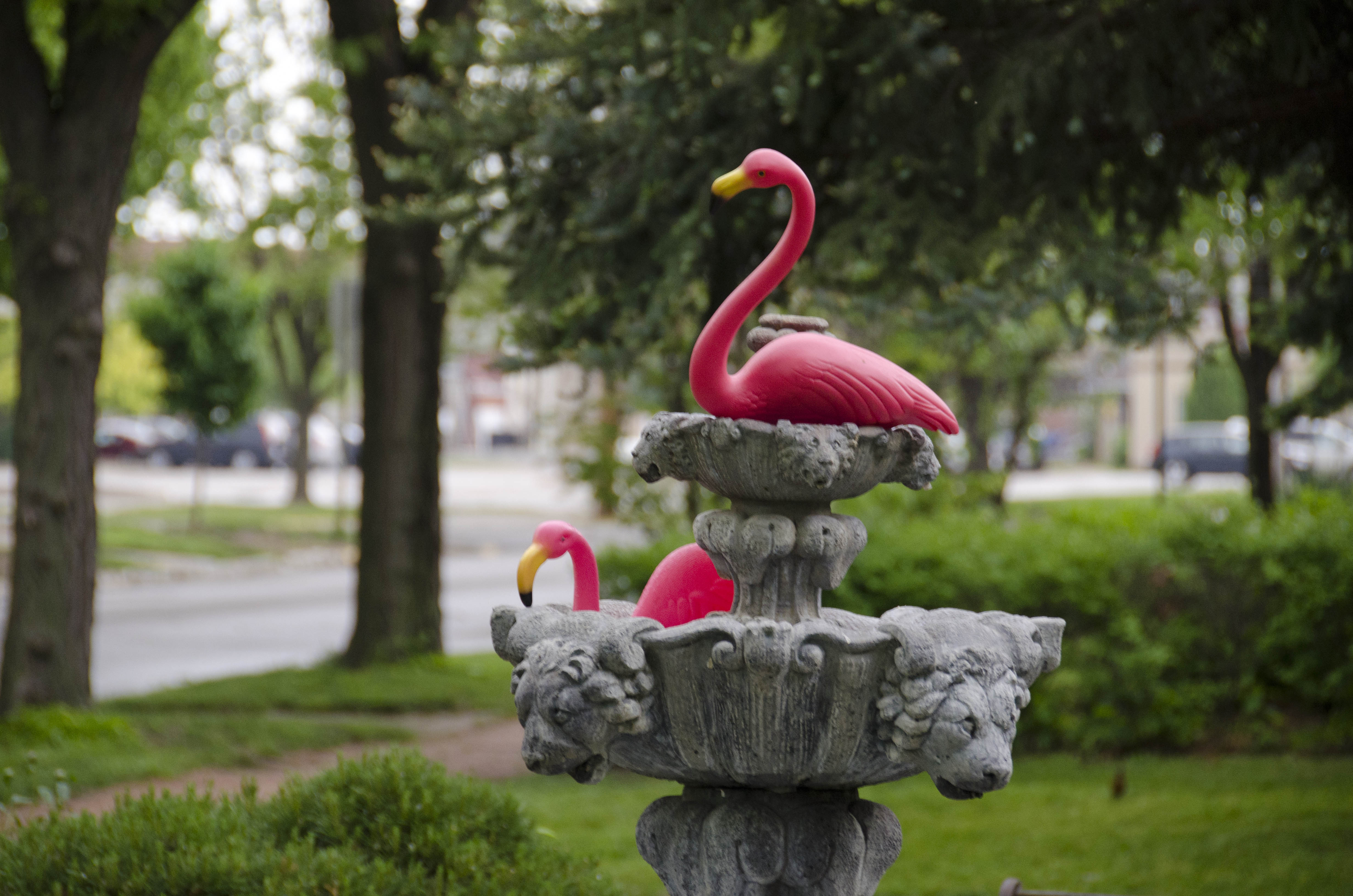 As a fundraiser for the Audubon Society, Gaia Salon is flocking local yards with pink flamingos. Someone flocked us. Hmm. We have a who done it on our hands. The front yard, even the fountain is full of these joyful pieces of yard art. Don’t expect them to stay, though. Tomorrow they’ll be moved to the yard of some other unsuspecting souls.
