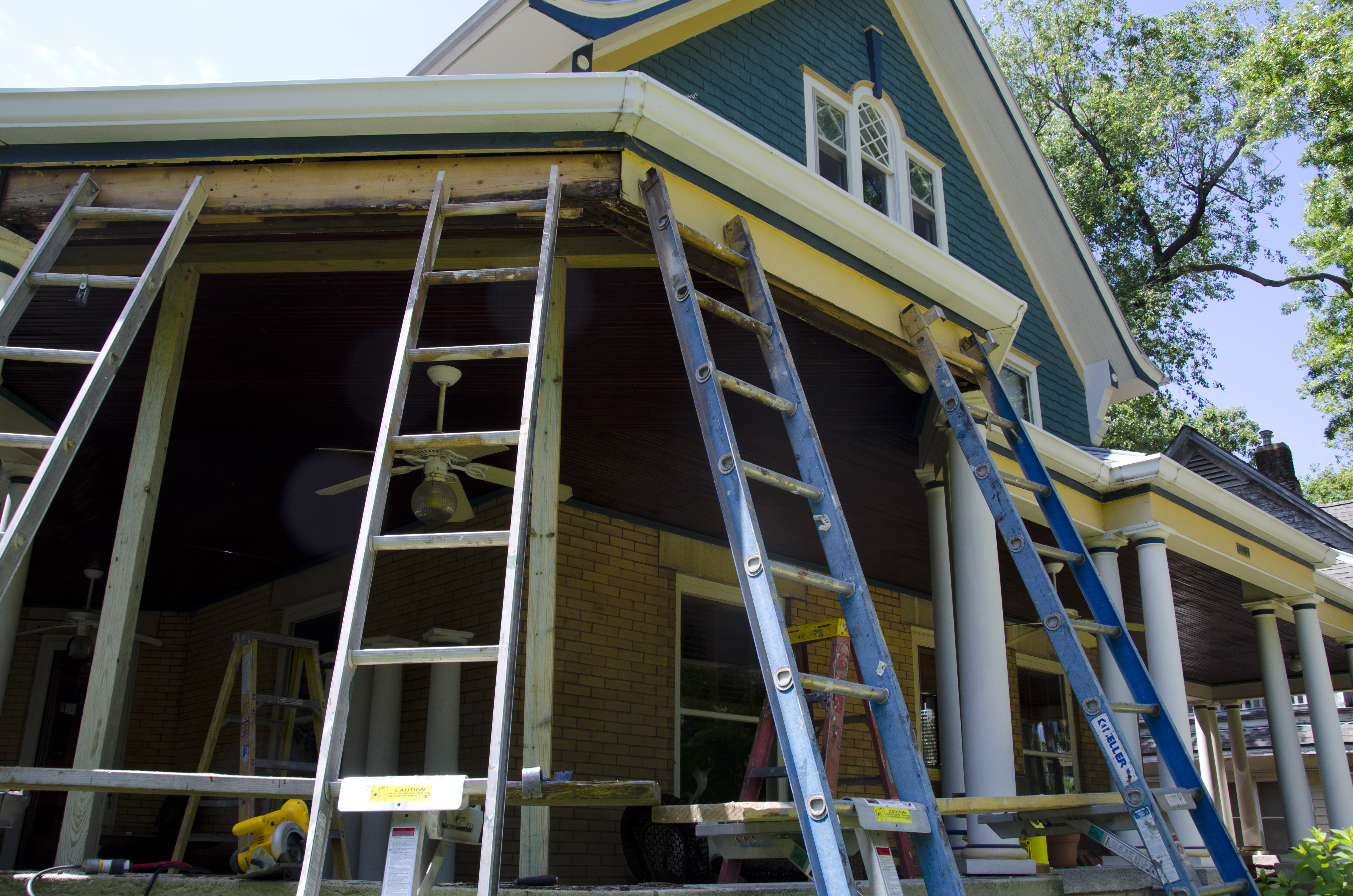Our contractor, Russ, employs a euphemism which we dread hearing  … “deferred maintenance.” That is when a home owner doesn’t stay on top of repairs and something that could have been a smaller job turns into a bigger and hence more expensive one. So when my husband recently discovered water coming through the porch roof between two of the columns, I got on the phone to Russ. Russ sent brother Tim over who told me that they were going to have to prop up the porch roof and pull several columns so that they could remove and replace the damaged boards. I didn’t like the image that conjured up. I had visions of broken columns and  layers of rotten wood. The wrap around porch with its columns and its varnished wood ceiling is one of our favorite features of our house and I didn’t want anything bad happening to it. Russ and Tim and the guys have always done good work for us, though, so I did my best to put my worries aside.
