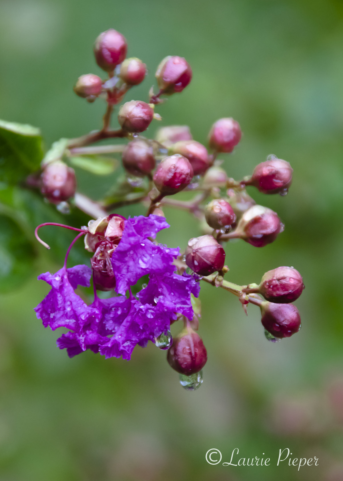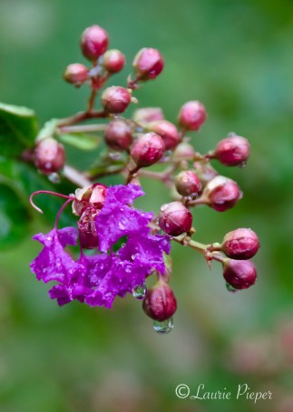 Along with almost everything else in the garden this year, our Crape Myrtles have now started blooming about a month early. After the mild winter that we had in Kansas, the die-back on the Crape Myrtles was almost non-existent. Some years the die-back is quite severe and we have to cut the trees/bushes to the ground. We received 1.27″ of rain last night. This as made everyone happy, especially the farmers, as prior to that we had received only .01″ of precipitation this month. With the garden all wet this morning, I tried to get a couple of pictures. These are of are buds and blooms on Crape Myrtle “Royalty” – one of my favorite plantings.