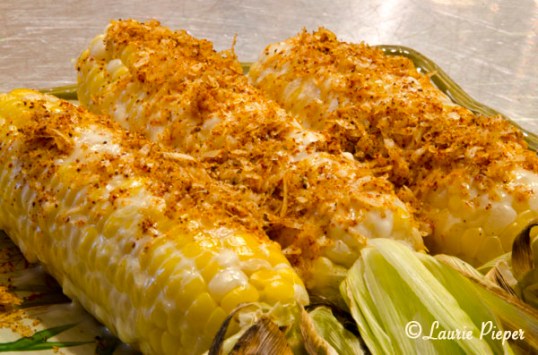 (4) When corn is done, pull back husks, brush corn with lime-mayo mixture, then sprinkle with spiced cheese mixture. Serve right away.