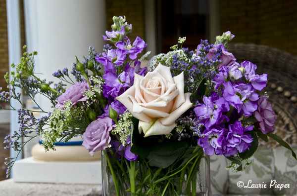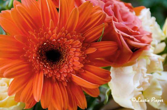 We hosted a charming wedding at Bed & Breakfast yesterday. There was quite a bit to do to get ready and so, unfortunately, I didn’t have time to photograph the cake or the bride’s bouquet. I did take a few photos of some of the other flowers today, though. The bride loves orange, especially orange daisies. So I made her bouquet with four styles of orange gerbera daisies along with coppery-pink florists roses and peach-colored spray roses. The textures and colors were so cheerful that I used the same assortment of flowers to decorate the cake. We at The Morning Star wish the bride and groom a very happy future together!
