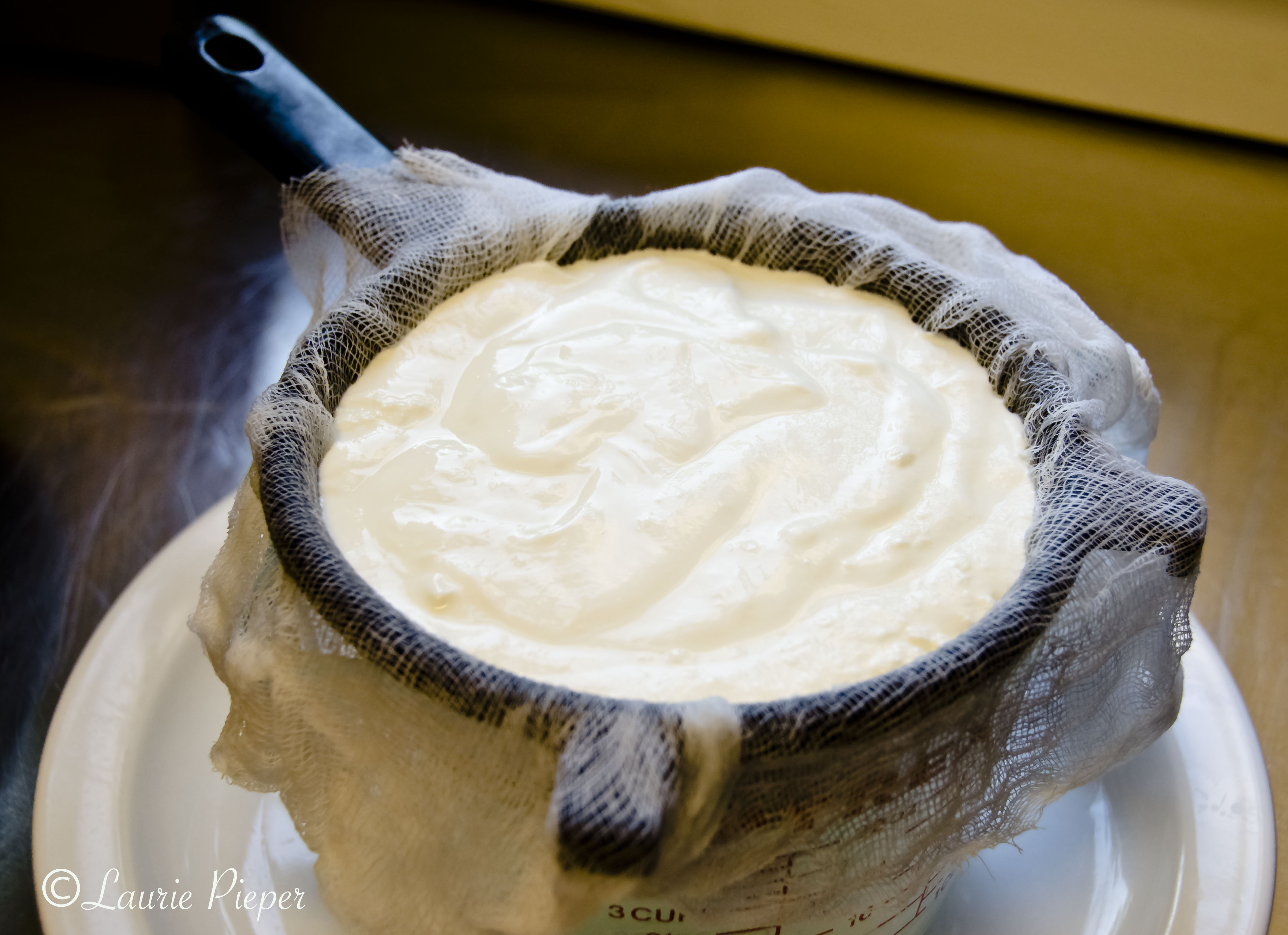 (5) Line a strainer with damp cheesecloth. Place strainer over a bowl. Spoon the surface skin off the yogurt, then transfer yogurt to the strainer. Place in the refrigerator and allow to strain for 2 hours or until about 1 c. of whey has drained off. Use yogurt right away or transfer to a glass container, cover and store in the refrigerator.