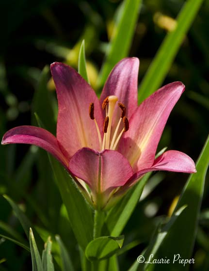 Asiatic Lily “Kiss Me Kate” – named, I assume after the Cole Porter musical – is the standout in my garden this week. I planted the “Kate” bulbs in 2000 and they are still producing beautifully every year. This year, however, we had unusually cool weather for early June – that is, until yesterday afternoon when our official temperature was 99 degrees F. As a result, I had the opportunity to observe that the blooms that opened during the cooler temperatures had much darker coloration than those that opened on warmer days. Kiss Me Kate is a bicolor lily often described as being magenta and creamy yellow. Mine are usually a mauvish-pink turning to salmon-pink at the border of the yellow centers; and just this year did I see a few that were close to red on the outer edges. I have 5 groupings of the Kates, standing at about 3 feet tall. In early morning and early evening light, the colors look like those of the sunset.