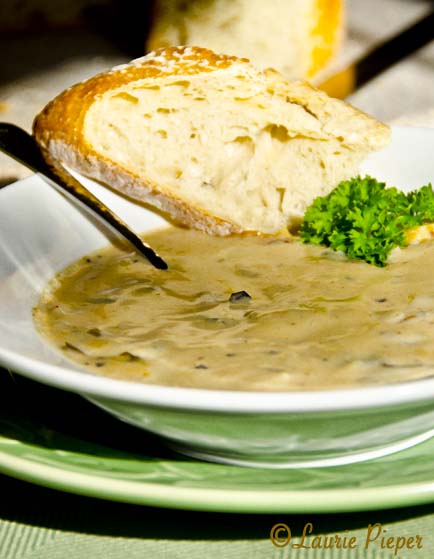 3. Melt the remaining butter in the pan from the onions, stir in the mushrooms, and saute until almost cooked. Add the sherry and then salt and pepper the mushrooms. The sherry should be absorbed fairly quickly at which time the mushrooms should be done cooking. Stir mushrooms into soup base.