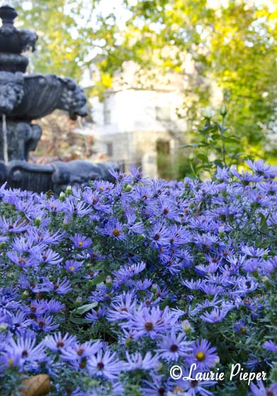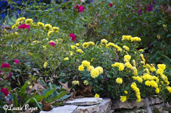 It was with some sentimentality that I photographed the garden yesterday. I knew that a freeze was predicted for last night, a sure sign that garden will be winding down for the year. As I sit here and write before sunrise, it is 30 degrees F. outside; and though it is toasty warm in the B&B, I know that once the sun comes up and I take a look around, I’ll see that some of my flowers and herbs have been nipped by the cold. It will take cooler temperatures to make the hardy perennials and shrubs go dormant for the winter. In fact, if the day time temperatures are warm enough, the ground cover roses will keep producing blooms for up to 4 more weeks, but the other roses are almost done for the year. The chrysanthemum plants will be fine, but probably not the flowers. The asters, which put out one big flush of flowers every year in late October have had their show, though they will have color for a little longer.